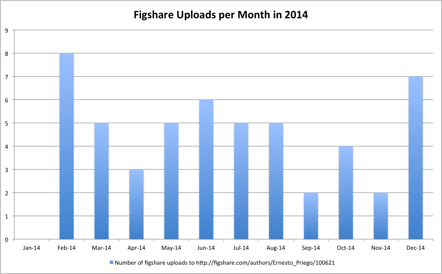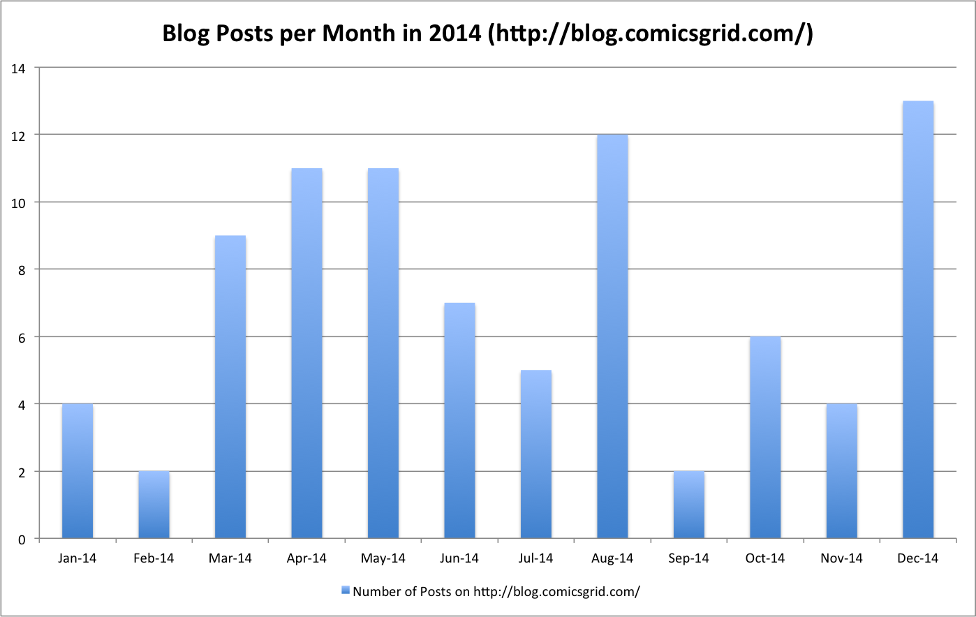Here an attempt to visualise what I was up to in 2014 publishing, research and teaching engagement wise. I have focused first on how many blog posts I published on this blog per month, how many blog posts I edited and/or authored for the Comics Grid blog, how many outputs I shared on figshare and finally a general numeralia of some main categories of my 2014 activity.