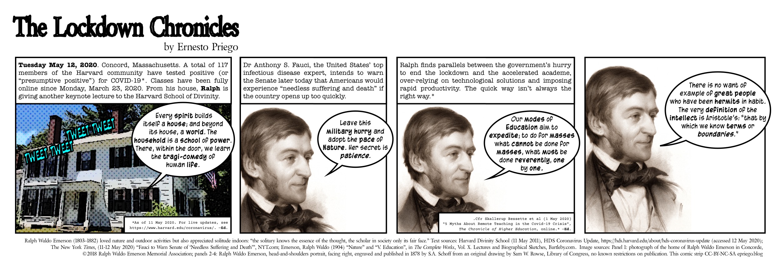 Text sources: Harvard Divinity School (11 May 2011), HDS Coronavirus Update, https://hds.harvard.edu/about/hds-coronavirus-update (accessed 12 May 2020); The New York Times, (11-12May 2020) “Fauci to Warn Senate of ‘Needless Suffering and Death’”, NYT.com; Emerson, Ralph Waldo (1904) “Nature” and “V. Education”, in The Complete Works., Vol. X. Lectures and Biographical Sketches, Bartleby.com.