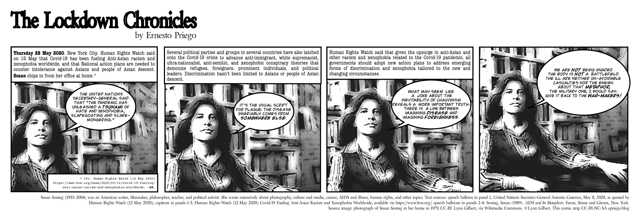Text sources: Text sources: speech balloon in panel 1, United Nations Secretary-General Antonio Guterres, May 8, 2020, as quoted by Human Rights Watch (12 May 2020); captions in panels 1-3: Human Rights Watch (12 May 2020) Covid-19 Fueling Anti-Asian Racism and Xenophobia Worldwide, available via https://www.hrw.org/; speech balloons in panels 2-4: Sontag, Susan (1989). AIDS and Its Metaphors. Farrar, Straus and Giroux, New York.