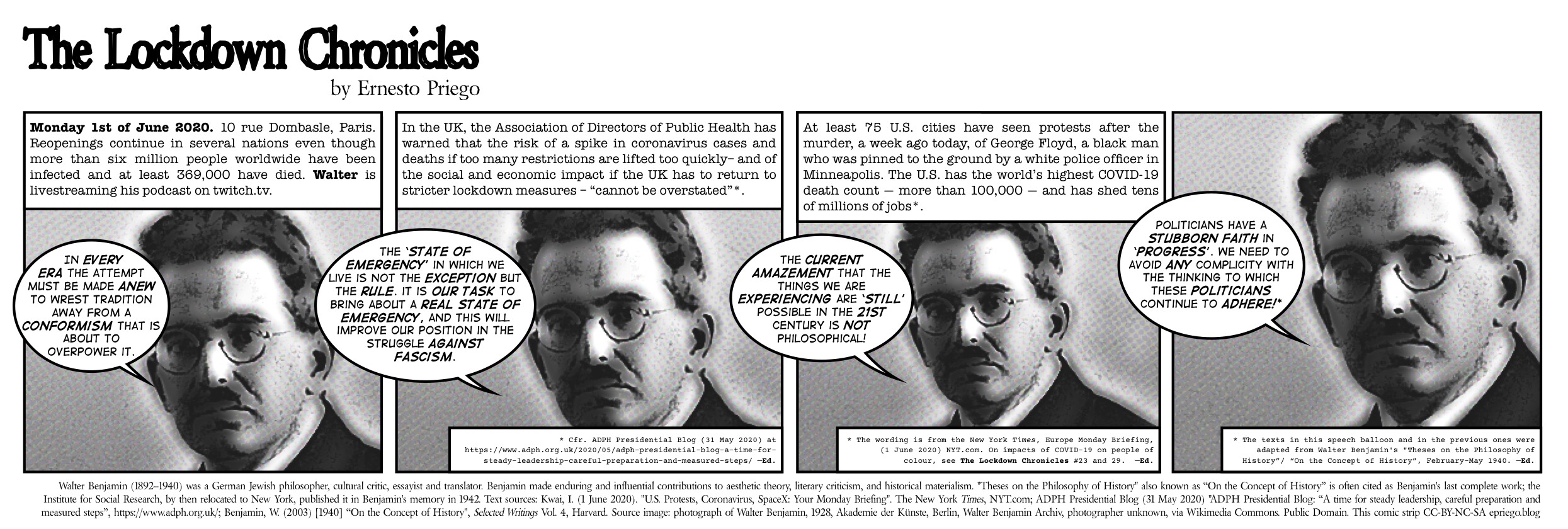 Text sources: Kwai, I. (1 June 2020). “U.S. Protests, Coronavirus, SpaceX: Your Monday Briefing”. The New York Times, NYT.com; ADPH Presidential Blog (31 May 2020) “ADPH Presidential Blog: “A time for steady leadership, careful preparation and measured steps”, https://www.adph.org.uk/; Benjamin, W. (2003) [1940] “On the Concept of History”, Selected Writings Vol. 4, Harvard.