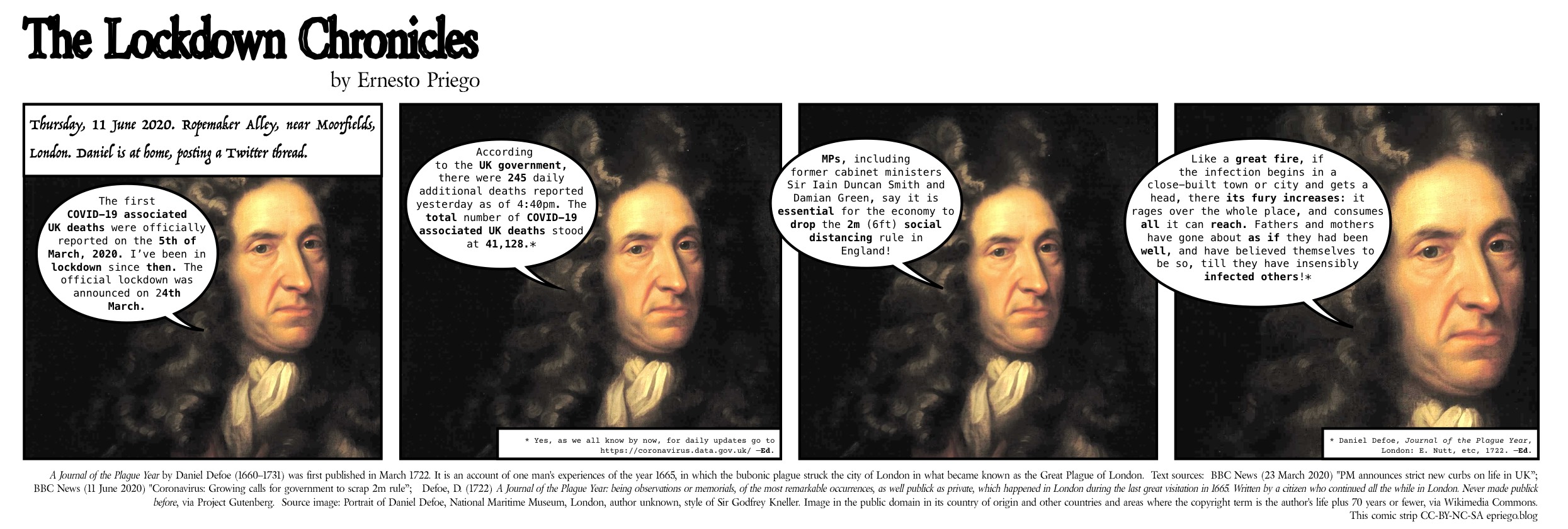 Text sources: BBC News (23 March 2020) “PM announces strict new curbs on life in UK”; BBC News (11 June 2020) “Coronavirus: Growing calls for government to scrap 2m rule”; Defoe, D. (1722) A Journal of the Plague Year: being observations or memorials, of the most remarkable occurrences, as well publick as private, which happened in London during the last great visitation in 1665. Written by a citizen who continued all the while in London. Never made publick before, via Project Gutenberg.