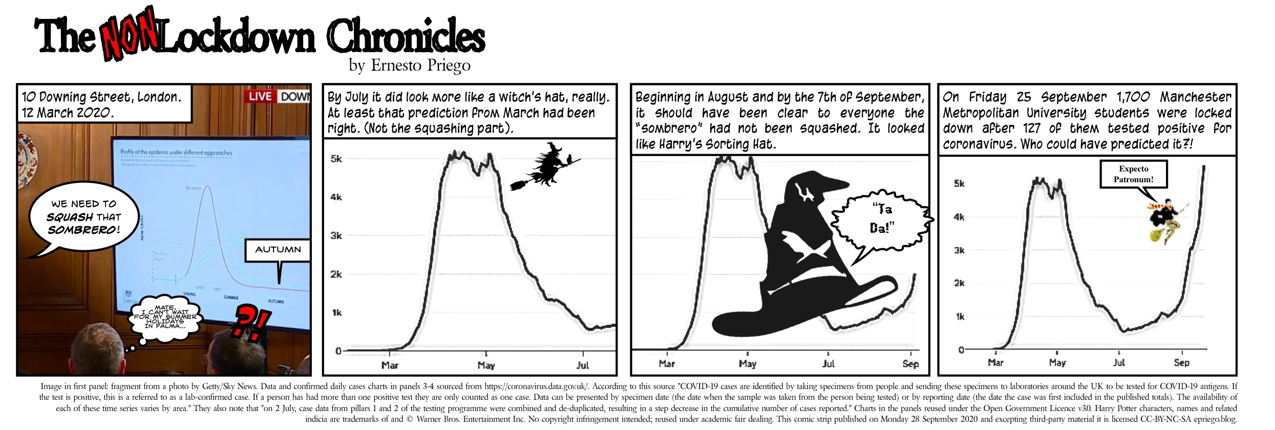 Image in first panel: fragment from a photo by Getty/Sky News, via metro.co.uk at https://www.metro.news/we-need-to-squash-this-sombrero-top-scientists-explain-their-tactics-to-beat-the-pandemic/1942520/. Data and confirmed daily cases charts in panels 3-4 sourced from https://coronavirus.data.gov.uk/. According to this source “COVID-19 cases are identified by taking specimens from people and sending these specimens to laboratories around the UK to be tested for COVID-19 antigens. If the test is positive, this is a referred to as a lab-confirmed case. If a person has had more than one positive test they are only counted as one case. Data can be presented by specimen date (the date when the sample was taken from the person being tested) or by reporting date (the date the case was first included in the published totals). The availability of each of these time series varies by area.” They also note that “on 2 July, case data from pillars 1 and 2 of the testing programme were combined and de-duplicated, resulting in a step decrease in the cumulative number of cases reported.” Charts in the panels reused under the Open Government Licence v3.0. Harry Potter characters, names and related indicia are trademarks of and © Warner Bros. Entertainment Inc. No copyright infringement intended; reused under academic fair dealing. On the MMU lockdown see https://www.theguardian.com/education/2020/sep/25/hundreds-of-manchester-students-locked-down-after-127-covid-cases. This comic strip published on Monday 28 September 2020 and excepting third-party material it is licensed CC-BY-NC-SA epriego.blog.