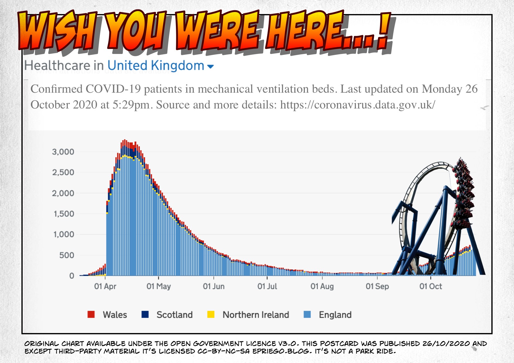 COVID-19 in the UK Government data Last updated on Monday 26 October 2020 at 05:29pm. Not looking any better. The latest R number is estimated at 1.2 to 1.4 with a daily growth rate range of 3% to 6%. Source: coronavirus-staging.data.gov.uk. Original chart available under the Open Government Licence v3.0. This postcard was published 26/10/2020 and except third-party material it’s licensed CC-BY-NC-SA epriego.blog. it’s not a park ride.