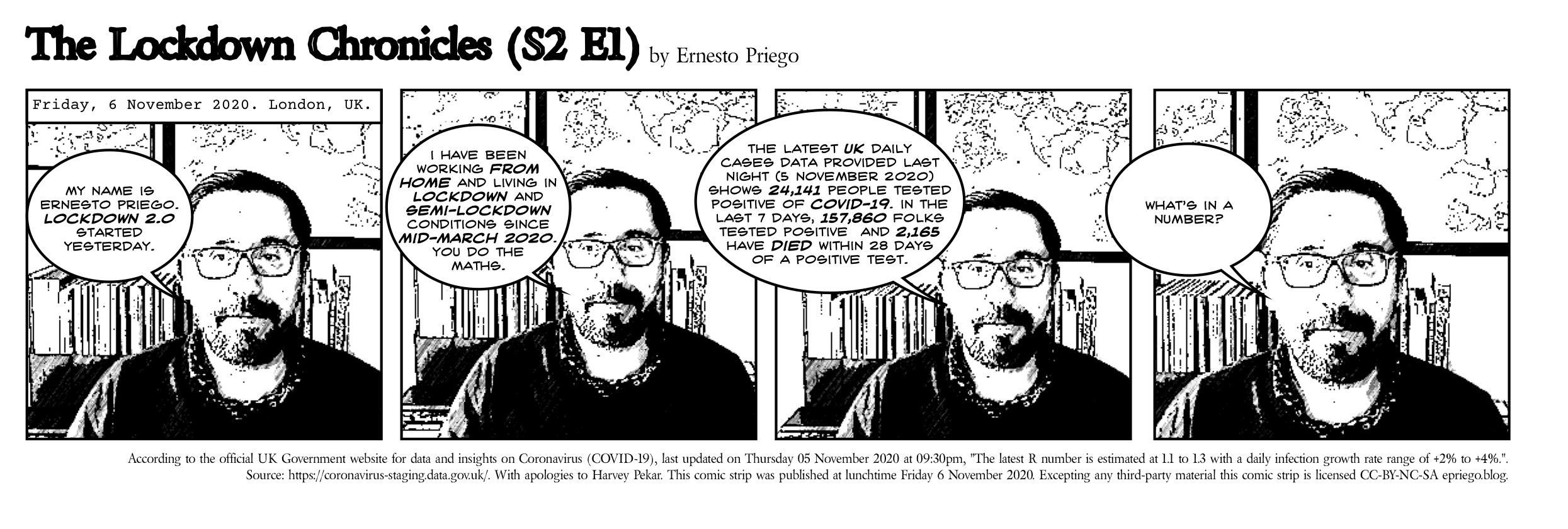 According to the official UK Government website for data and insights on Coronavirus (COVID-19), last updated on Thursday 05 November 2020 at 09:30pm, “The latest R number is estimated at 1.1 to 1.3 with a daily infection growth rate range of +2% to +4%.”. Source: https://coronavirus-staging.data.gov.uk/. With apologies to Harvey Pekar. This comic strip was published at lunchtime Friday 6 November 2020. Excepting any third-party material this comic strip is licensed CC-BY-NC-SA epriego.blog.