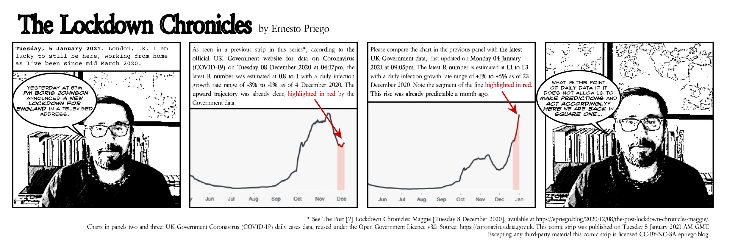 Charts in panels two and three: UK Government Coronavirus (COVID-19) daily cases data, reused under the Open Government Licence v3.0. Source: https://coronavirus.data.gov.uk. This comic strip was published on Tuesday 5 January 2021 AM GMT. Excepting any third-party material this comic strip is licensed CC-BY-NC-SA epriego.blog.