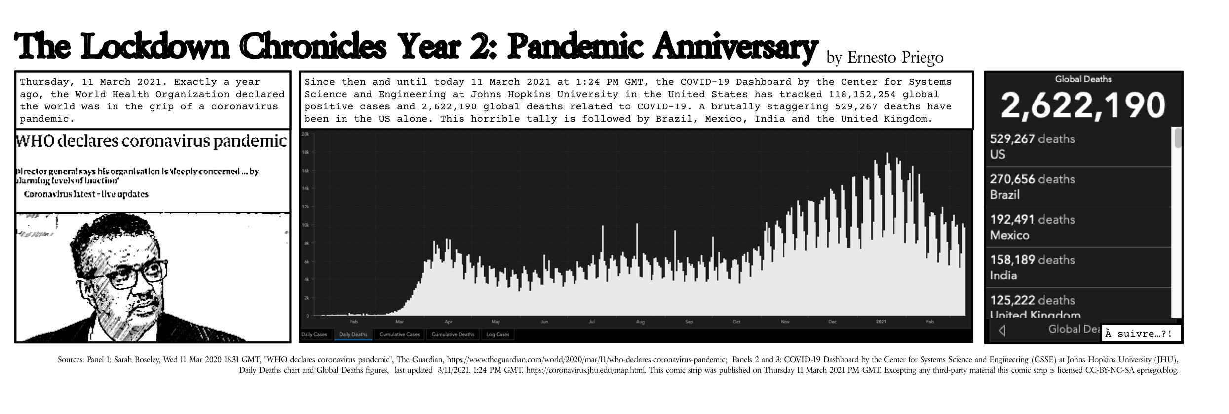 Sources: Panel 1: Sarah Boseley, Wed 11 Mar 2020 18.31 GMT, “WHO declares coronavirus pandemic”, The Guardian, https://www.theguardian.com/world/2020/mar/11/who-declares-coronavirus-pandemic; Panels 2 and 3: COVID-19 Dashboard by the Center for Systems Science and Engineering (CSSE) at Johns Hopkins University (JHU), Daily Deaths chart and Global Deaths figures, last updated 3/11/2021, 1:24 PM GMT, https://coronavirus.jhu.edu/map.html.
