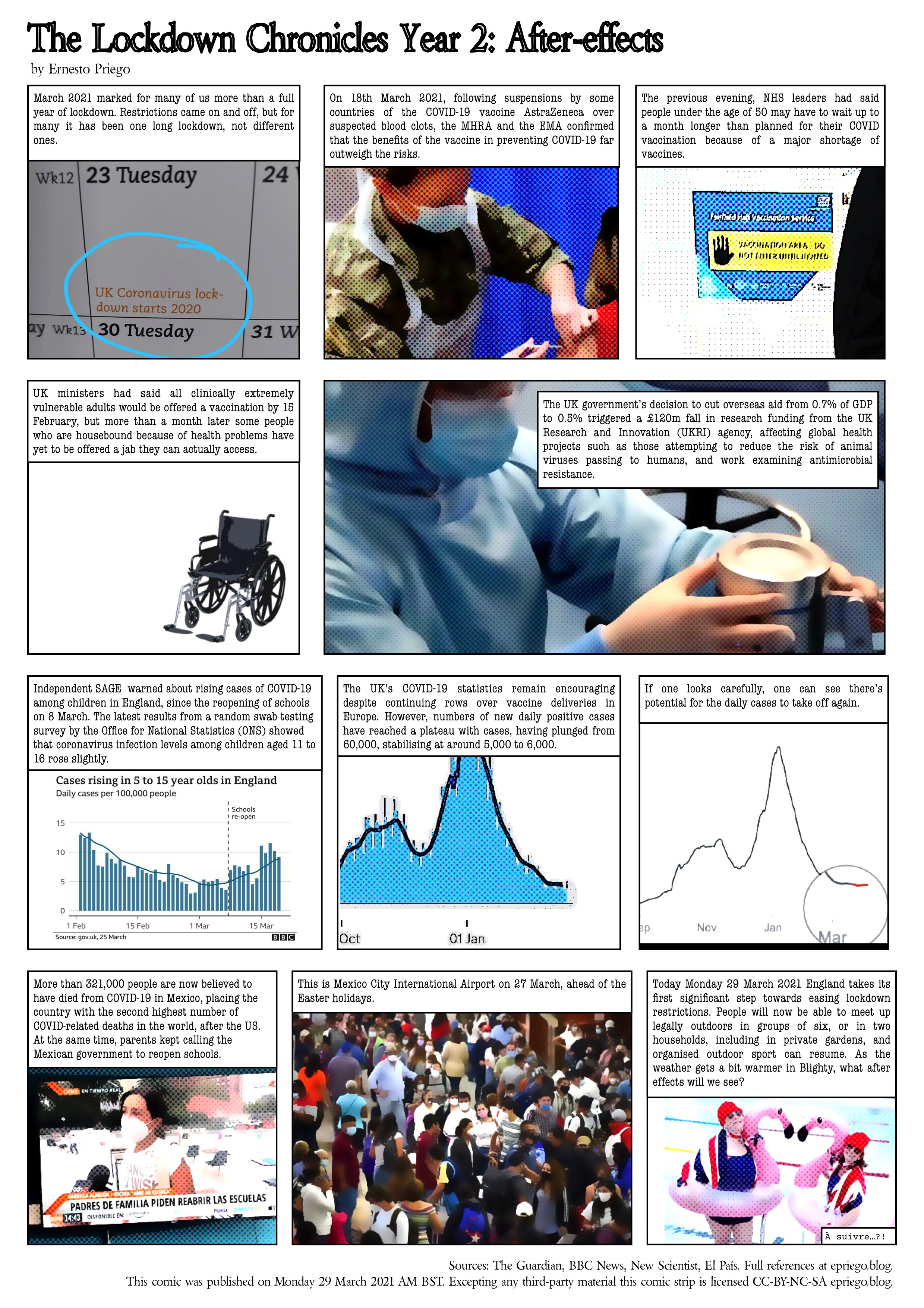 Panel 11: Photo: The swimmers return to the outdoor lido in Hillingdon. Photograph: David Levene/– The Guardian. Andrew Sparrow, The Guardian, 28 March 2021 22.30 BST. Johnson urges caution as England takes first big step out of lockdown. Available at https://www.theguardian.com/world/2021/mar/28/johnson-urges-caution-as-england-takes-first-big-step-out-of-lockdown