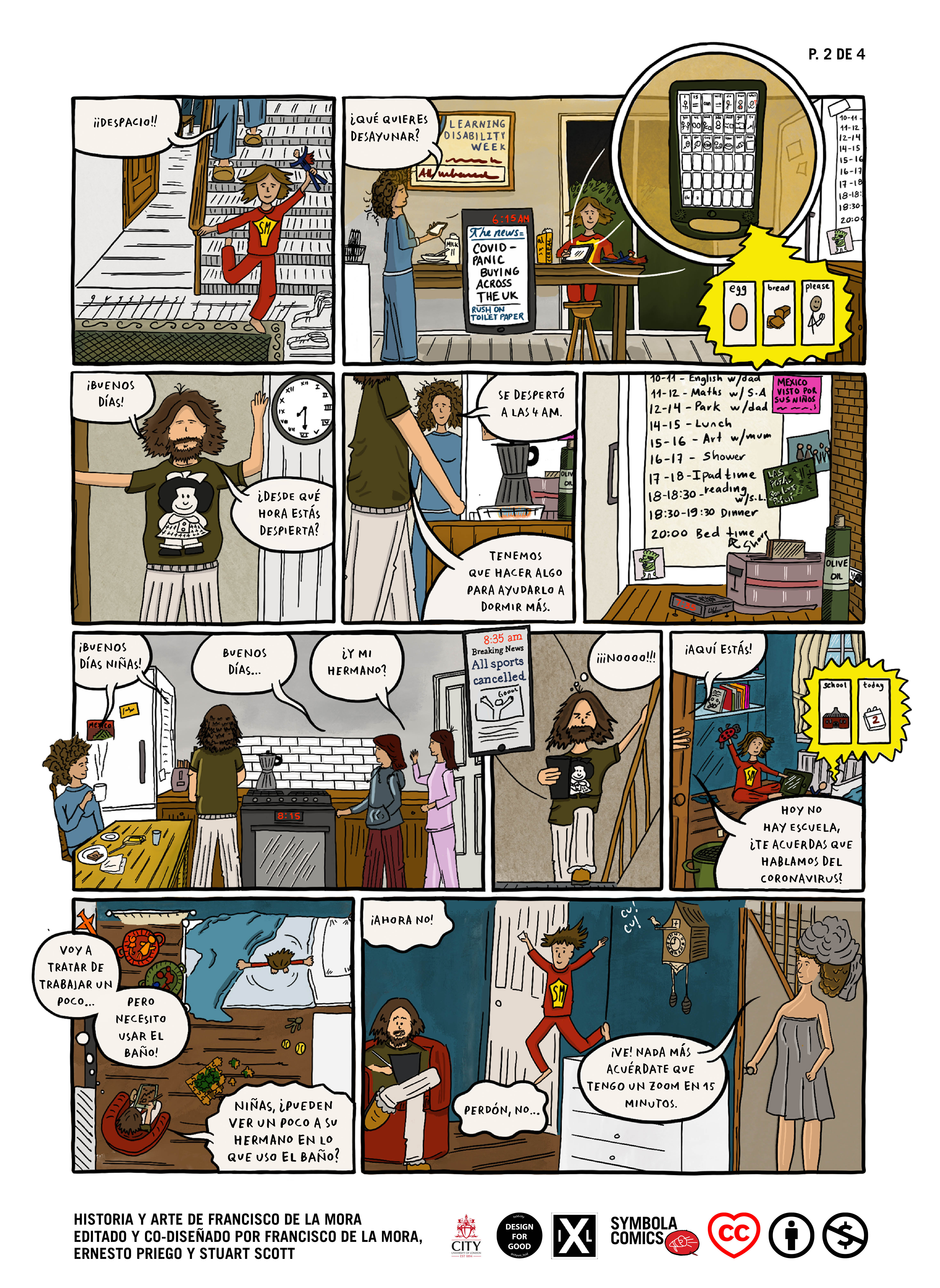 Co-diseñado y editado por Francisco de la Mora, Ernesto Priego y Stuart Scott, con arte e historia de Francisco de la Mora, “A Day in Lockdown” es parte de una serie de cómics que resultan de métodos de codiseño narrativo autoetnográfico y participativo y producido como resultado del City Interaction Lab, Centre for Human-Computer Interaction Design, City, Universidad de Londres, Reino Unido.