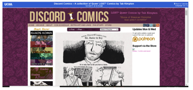 archive/20171001081918/http://www.discordcomics.com/ (archive capture from https://www.discordcomics.com/). The figure demonstrates the features of an archived page: comic title, date captured, calendar of captures, language.